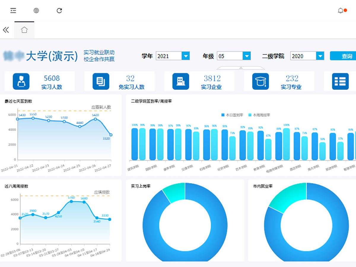实时汇总统计实习人数、地理定位记录、师生交流记录、实习日报等关键数据,学校可查看统计数据与详细数据,对实习过程全面管控